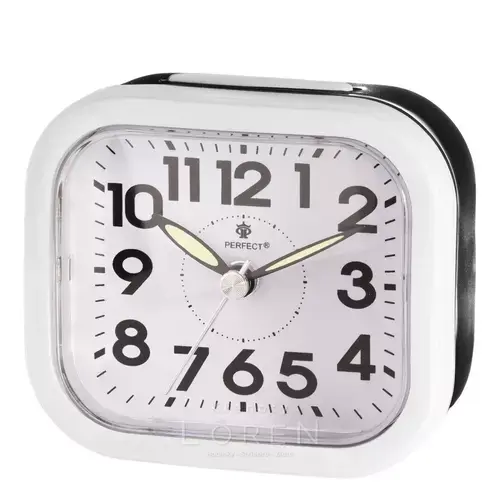 Praktický budík Perfect - biely s jednoduchým moderným dizajnom, budíkom a svetlom. Jednoduchý manipulácia nastavenia času a budenia.