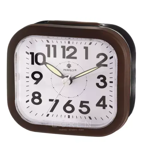 Praktický budík Perfect - hnedý s jednoduchým moderným dizajnom, budíkom a svetlom. Jednoduchý manipulácia nastavenia času a budenia.