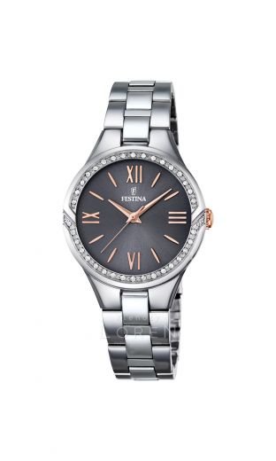 Dámske hodinky Festina v striebornej farbe v kombinácií s tmavošedým ciferníkom.