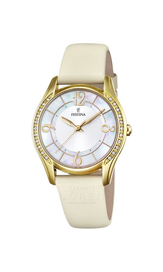 Dámske hodinky značky Festina s perleťovým ciferníkom a béžovým remienkom.
