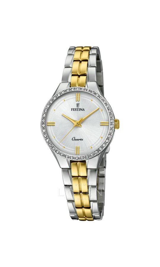 Dámske hodinky Festina v kombinácií striebornej a zlatej farby s bielym analógovým ciferníkom so zirkónmi po obvode.