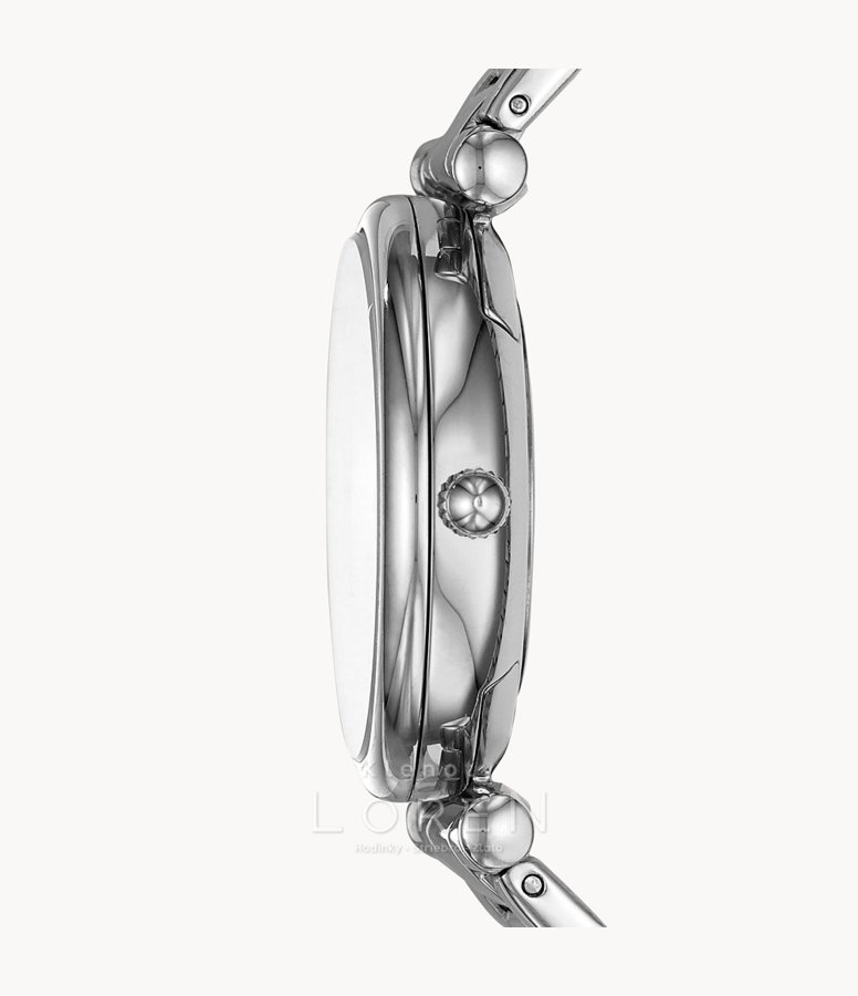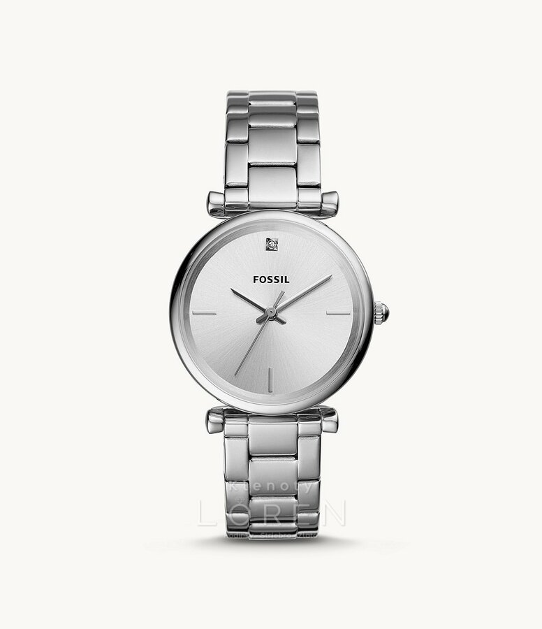Dámske hodinky Fossil v striebornej farbe so strieborným analógovým ciferníkom.