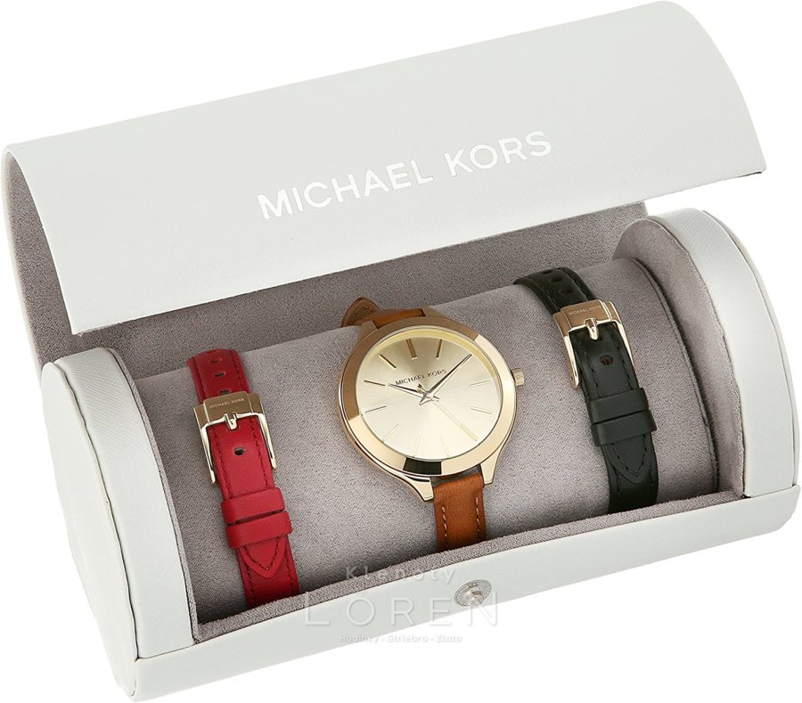 Dámske, elegantné hodinky značky Michael Kors na koženom remienku s možnosťou výmeny za červený alebo hnedý remienok (čierny remienok, ktorý je na obrázku nieje v ponuke).