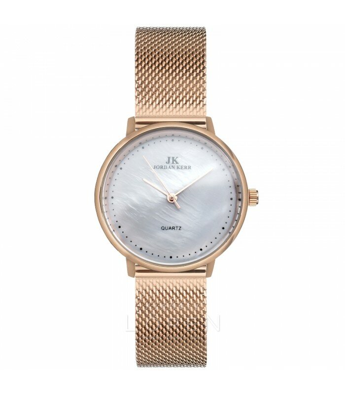 Elegantná dámske hodinky značky Jordan Kerr s jemným perleťovým číselníkom v bielej farbe. Púzdro a náramok je v ružovej farbe v IPRG povrchovej úprave. Hodinky sú vhodné na každodenné nosenie.
