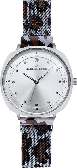 Elegantné dámske hodinky Jordan Kerr so strieborným ciferníkom v tvare kruhu s jemným zaoblením strán na puzdre. Hodinky majú IPS antialergickú povrchovú úpravu v striebornej farbe. Kovový náramok má zvierací motív, v hnedo-bielej kombinácií. Sú vhodné na bežné nosenie ale aj na spoločenské udalosti.