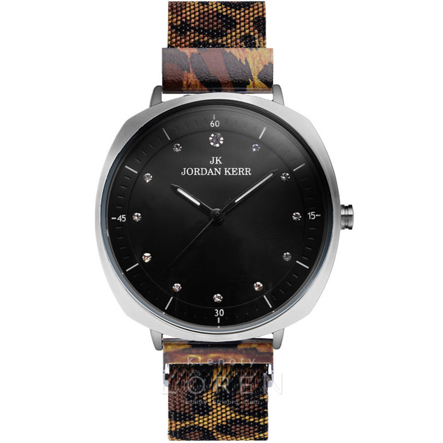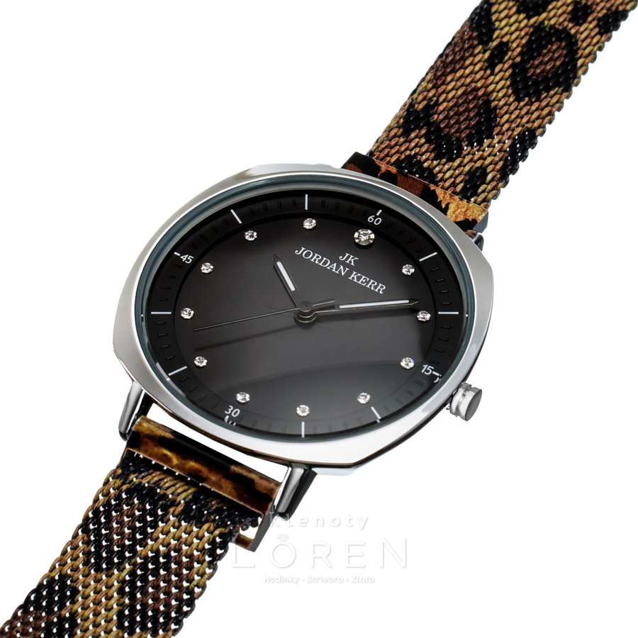 Elegantné dámske hodinky Jordan Kerr s čiernym ciferníkom v tvare kruhu s jemným zaoblením strán na puzdre. Hodinky majú IPS antialergickú povrchovú úpravu v striebornej farbe. Kovový náramok má zvierací motív, v hnedo-bielej kombinácií. Sú vhodné na bežné nosenie ale aj na spoločenské udalosti.