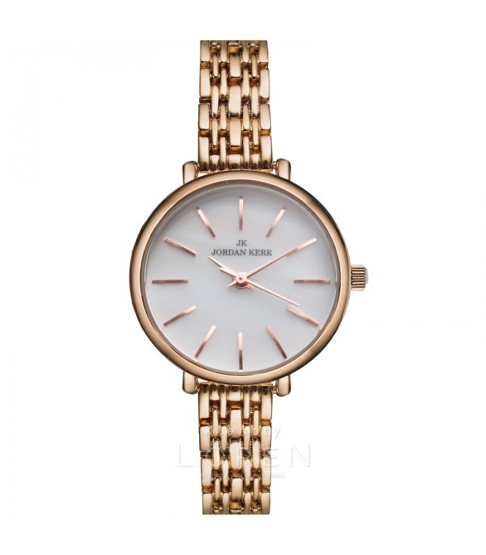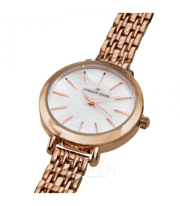 Elegantné dámske hodinky Jordan Kerr, s perleťovým ciferníkom v tvare kruhu. Jemné indexy vo farbe ružového zlata jemne ladia s kovovým článkovým náramkom. Hodinky majú IPS antialergickú povrchovú úpravu. Sú vhodné na bežné nosenie a aj na spoločenské udalosti.