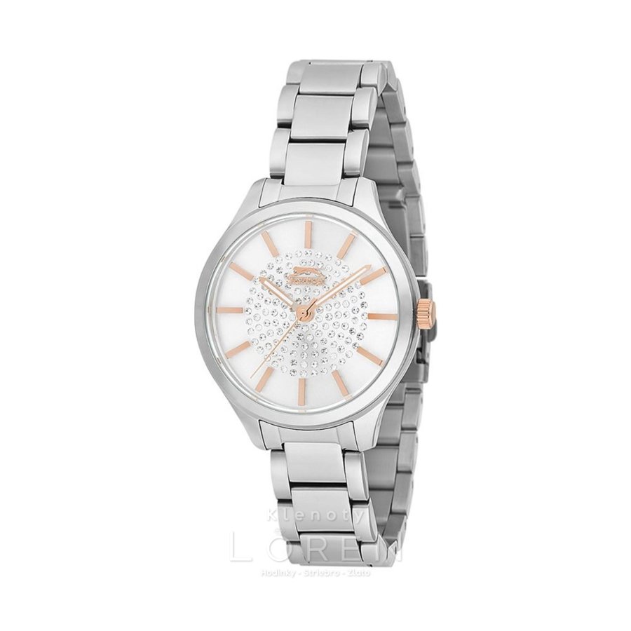 Dámske strieborné elegantné hodinky Slazenger s bielym ciferníkom.
