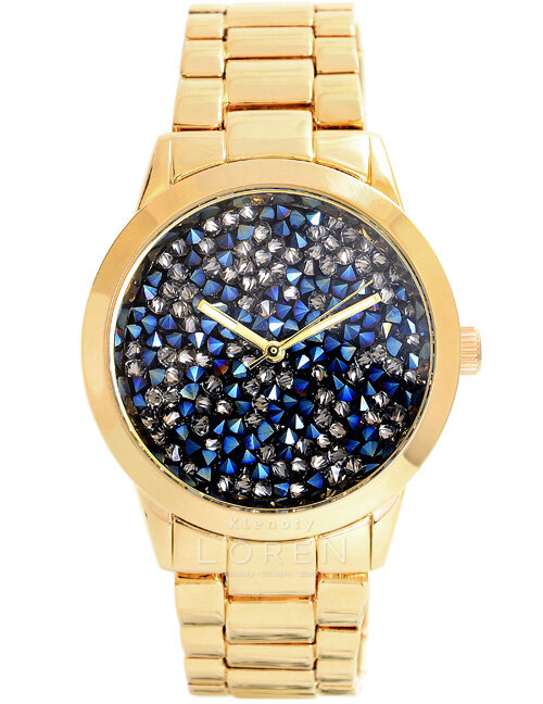 Štýlové dámske hodinky Jordan Kerr so swarovski zirkónmi osadenými na celej ploche ciferníka. Farba zirkónov je v kombinácií tmavomodrej a šedej farby. Hodinky majú IPG antialergickú povrchovú úpravu v zlatej farbe na náramku a puzdre.