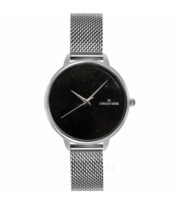 Elegantné dámske hodinky Jordan Kerr s jednoduchým ciferníkom v tvare kruhu v strednej veľkosti. Ciferník je v čiernej farbe s jemným trblietavým efektom. Hodinky majú IPS antialergickú povrchovú úpravu v striebornej farbe. Sú vhodné na bežné nosenie a aj na spoločenské udalosti.