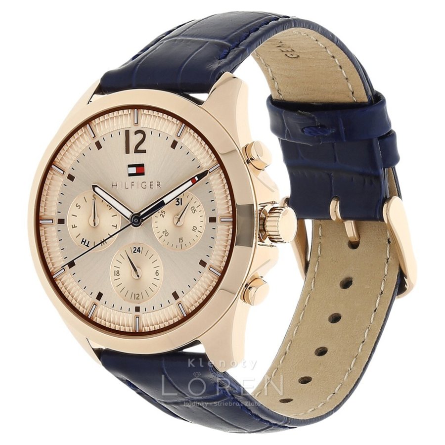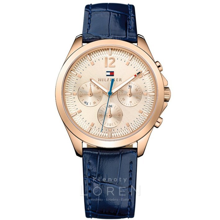 Dámske hodinky Tommy Hilfiger na koženom remienku tmavo modrej farby.