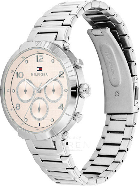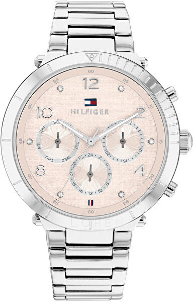 Dámske hodinky módnej značky Tommy Hilfiger sú ideálnym doplnkom pre ženy, ktoré si potrpia na štýlové a zároveň kvalitné doplnky. Ružový ciferník upúta tromi chronografmi s funkciou dátumu, dňa v týždni a 24h ciferníkom, nechýbajú ani trblietavé kamienky . Puzdro aj ťah sú vyrobené z ušľachtilej ocele. Doprajte si dizajnové hodinky Tommy Hilfiger, s ktorými budete stredobodom pozornosti len vy.