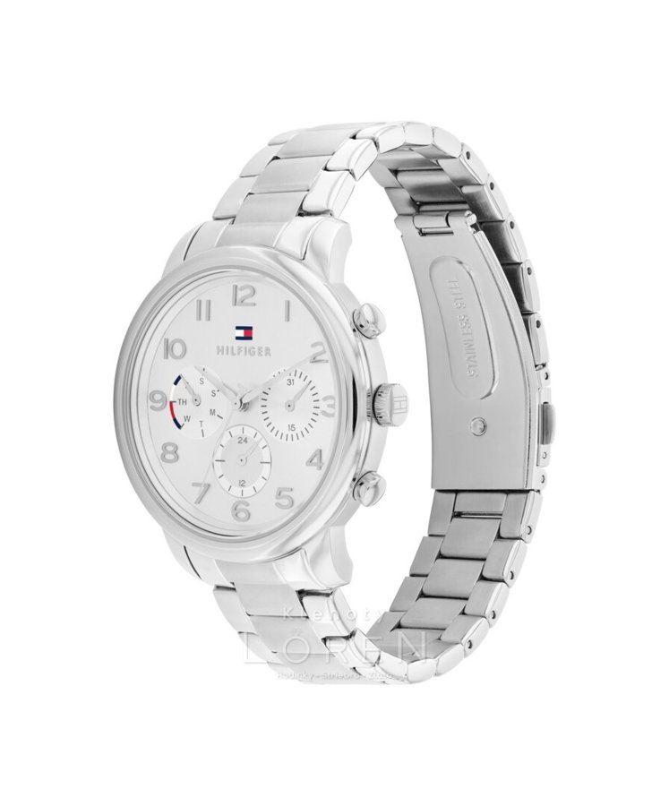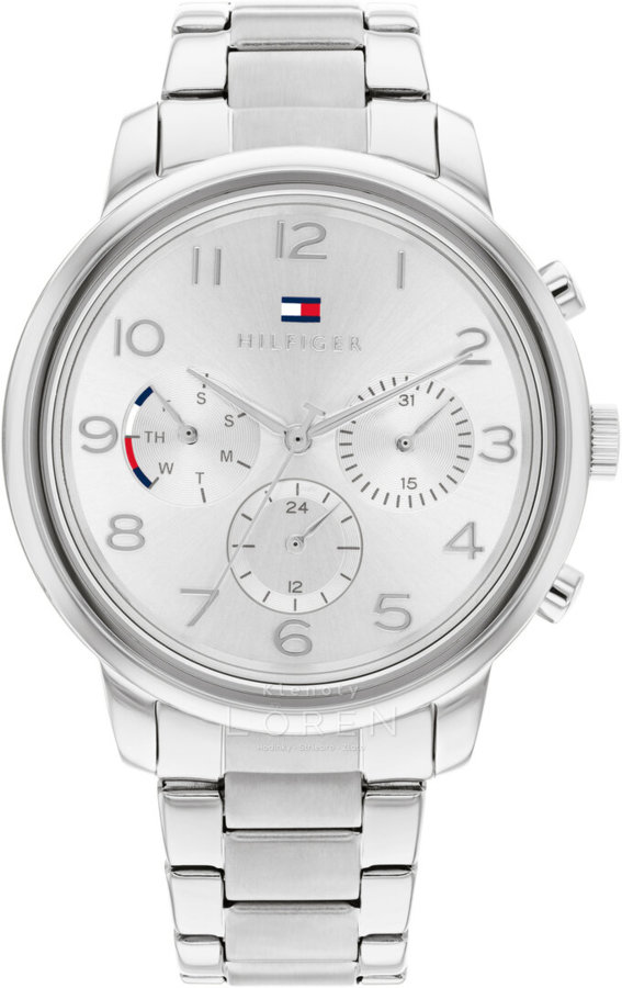 Dámske hodinky Tommy Hilfiger na kovovom remienku v striebornej farbe. Ciferník zdobí logo značky.