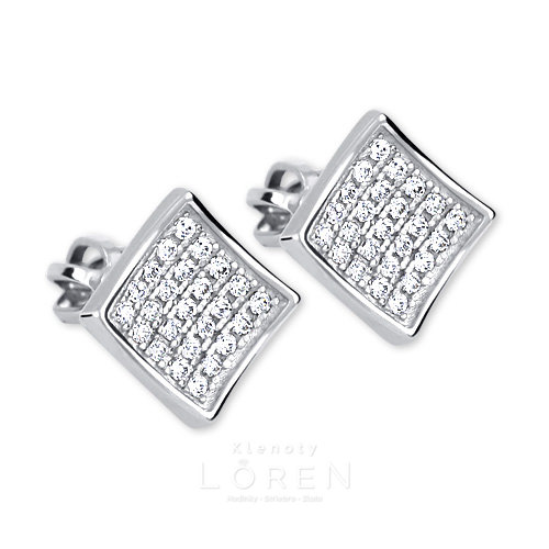 Minimalistické náušnice z bieleho zlata v tvare štvorčeka so žiarivými zirkónmi.