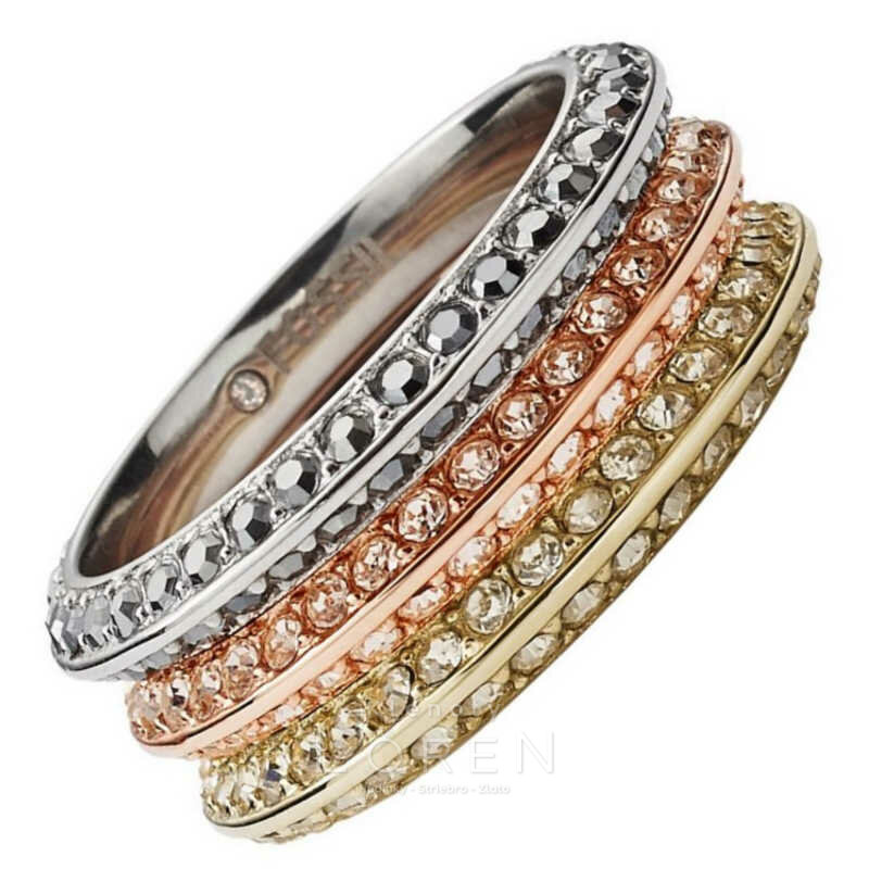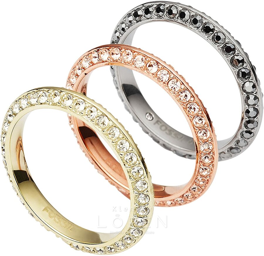 Dámsky, oceľový, trojitý prsteň Fossil v striebornej, medenej a zlatej farbe, zdobený žiarivými zirkónmi. Prstienok je možné oddeliť jednotlivo na tri časti alebo nosiť spolu.