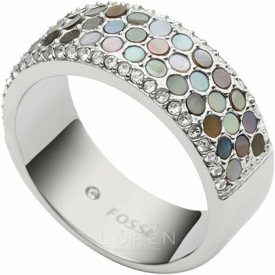 Dámsky, oceľový prsteň Fossil v striebornej farbe s elegantným perleťovým zdobením a žiarivými zirkónmi.