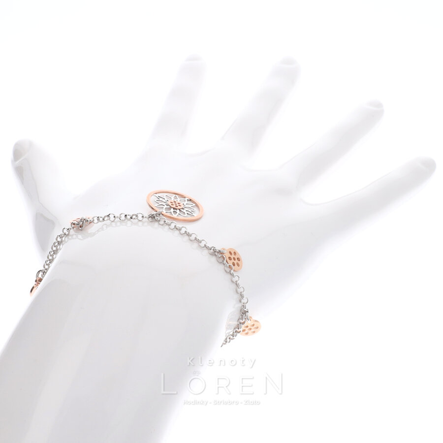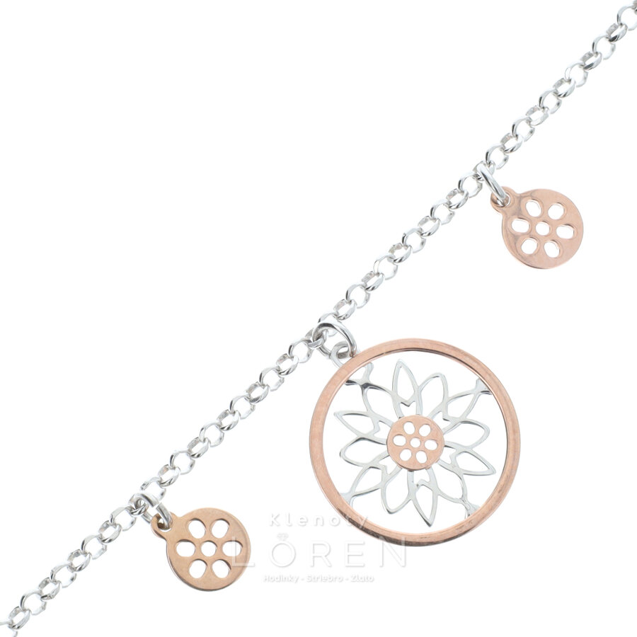 Dámsky, strieborný náramok s visiacími aplikáciami v medenej farbe.