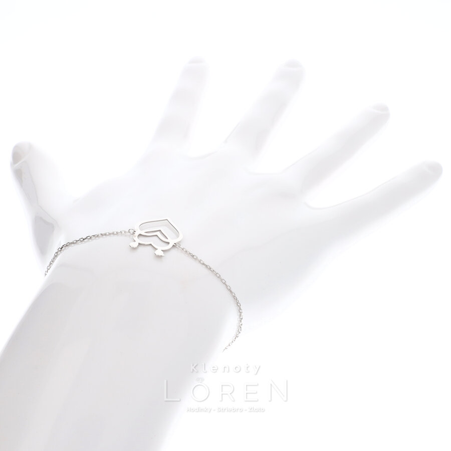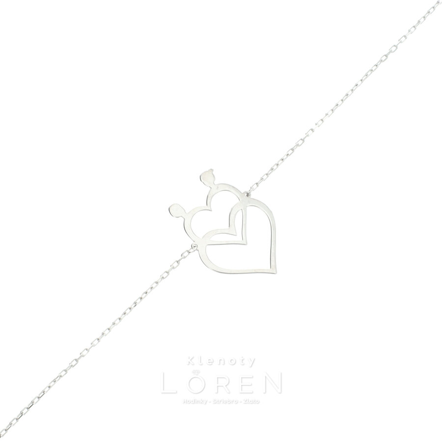 Dámsky, jemný, strieborný náramok s dvojitým srdiečkom uprostred náramku.