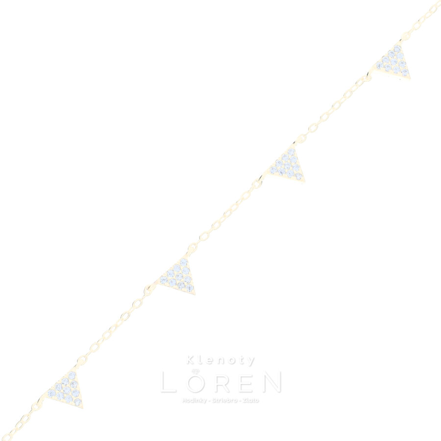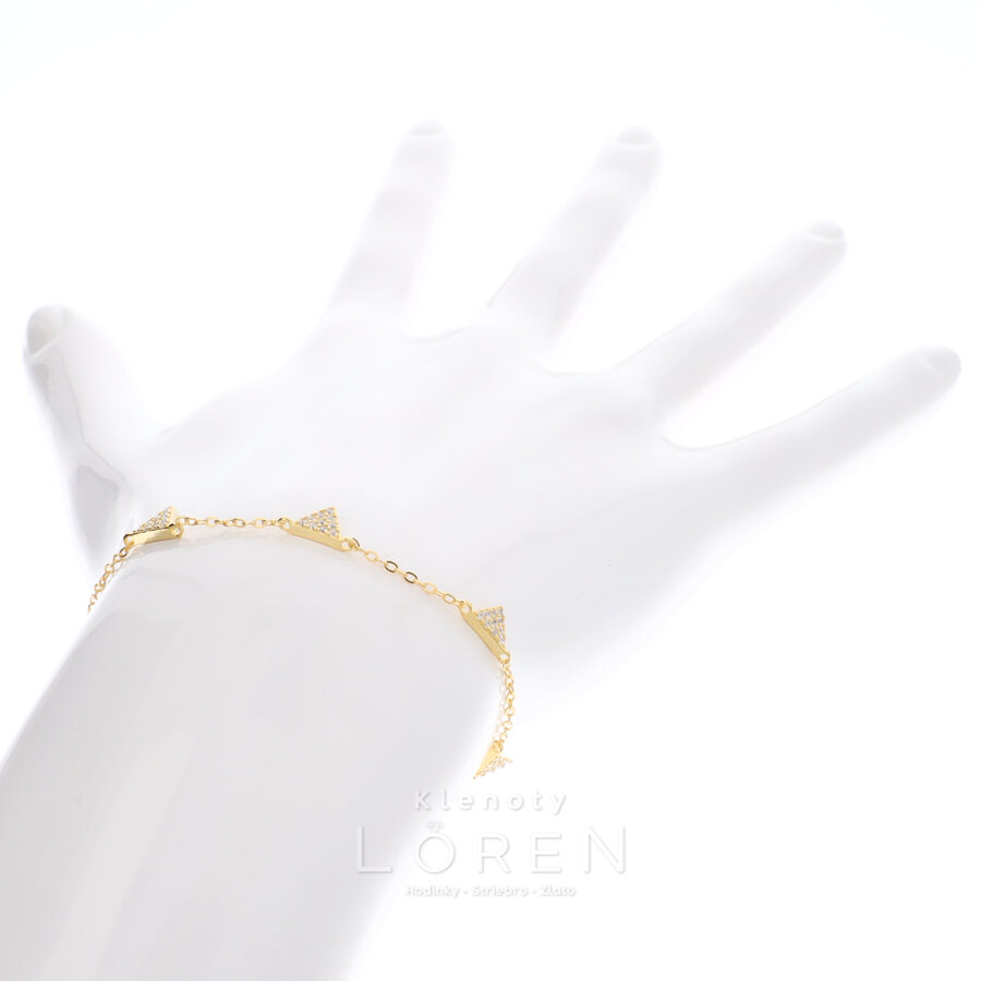 Dámsky, strieborný náramok v zlatej fareb s jemnými príveskami v tvare trojuholníkov so zirónmi.