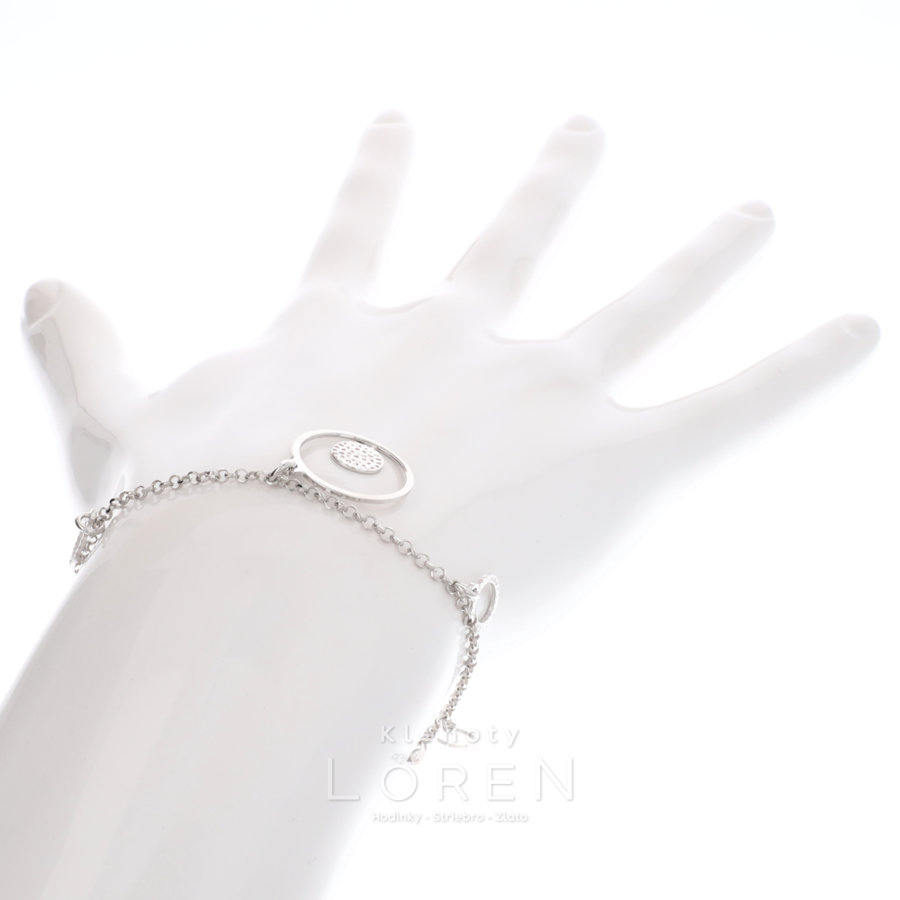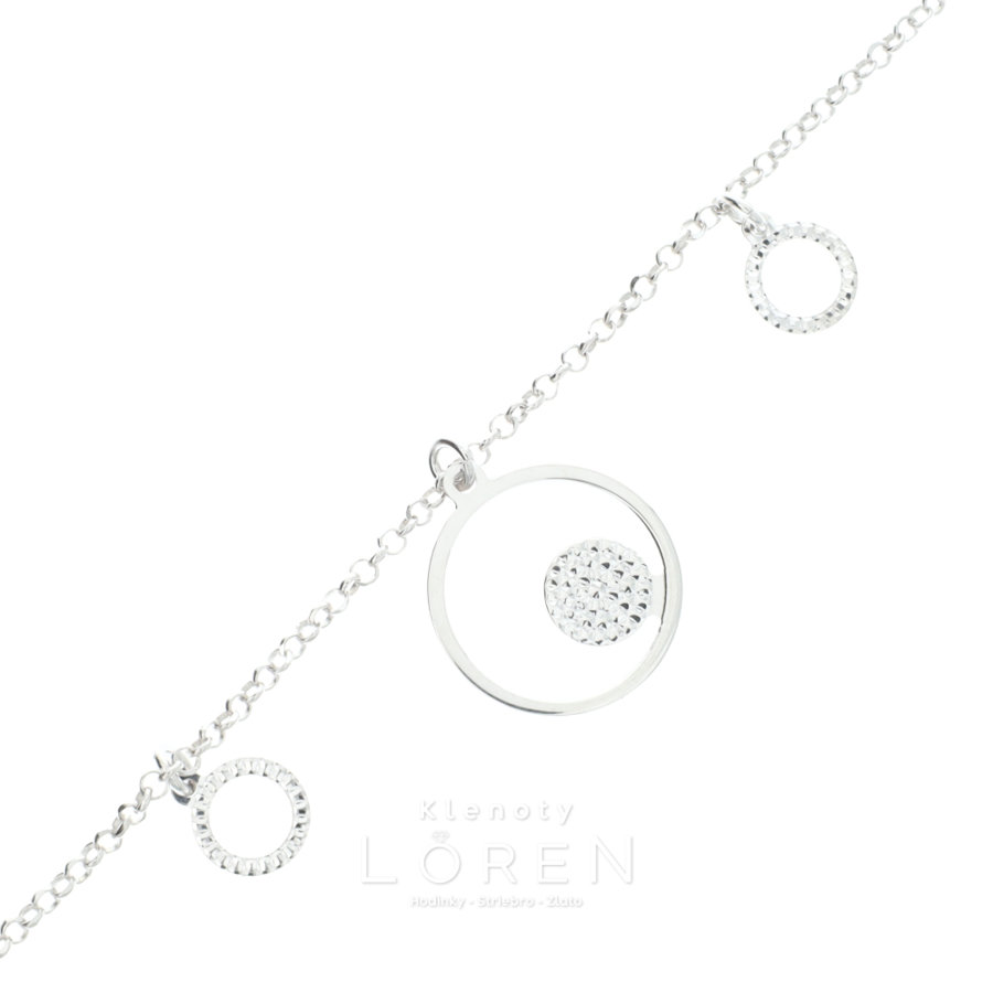 Dámsky, strieborný náramok s jemnými príveskami v tvare krúžkov, stredný, hlavný krúžok zdobený jemnými zirkónmi.