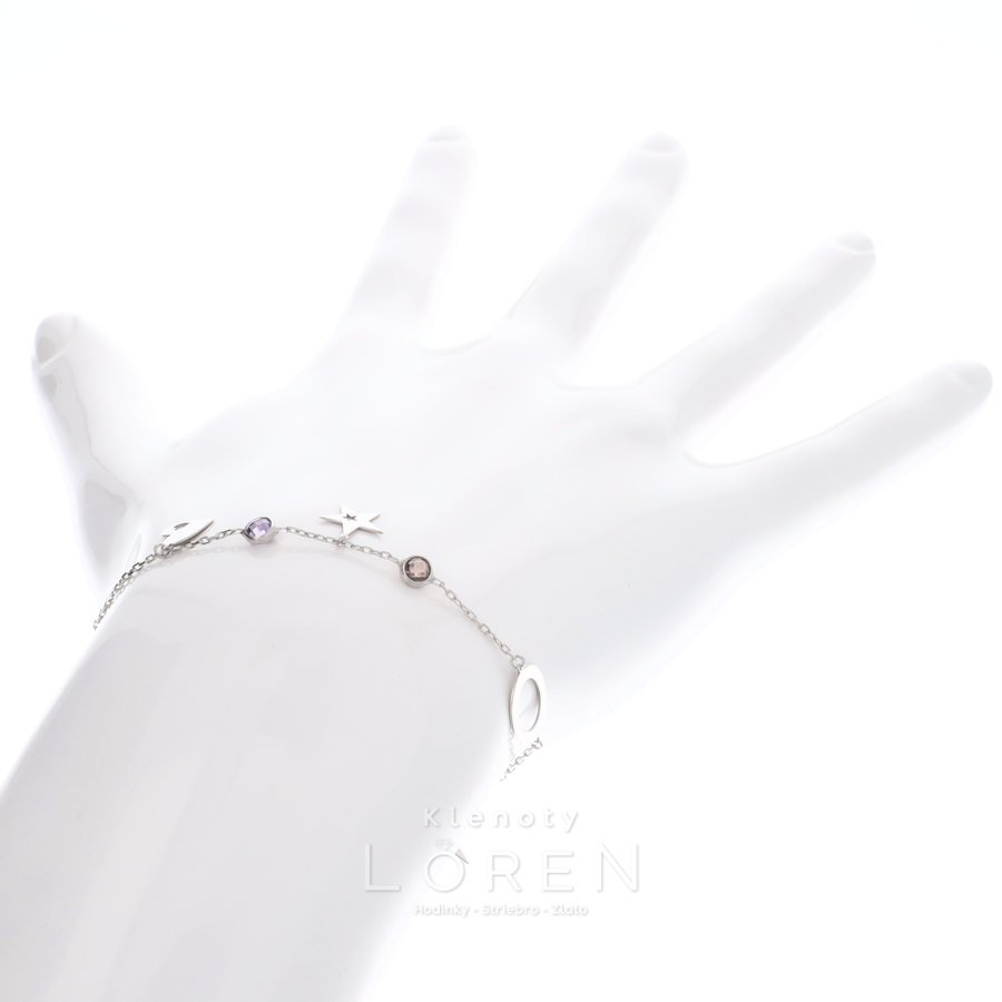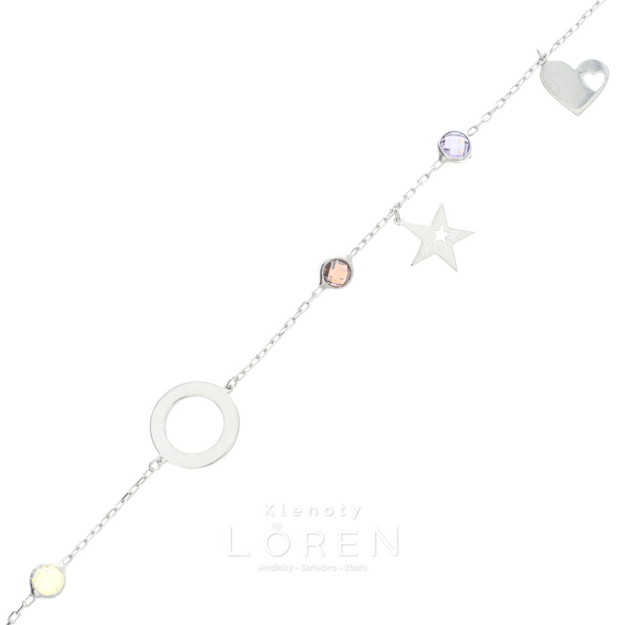 Dámsky, strieborný náramok s jemnými visiacími príveskami v tvare hviezdičiek a srdiečok. Náramok okrem iného zdobia aj farebné zirkóny.