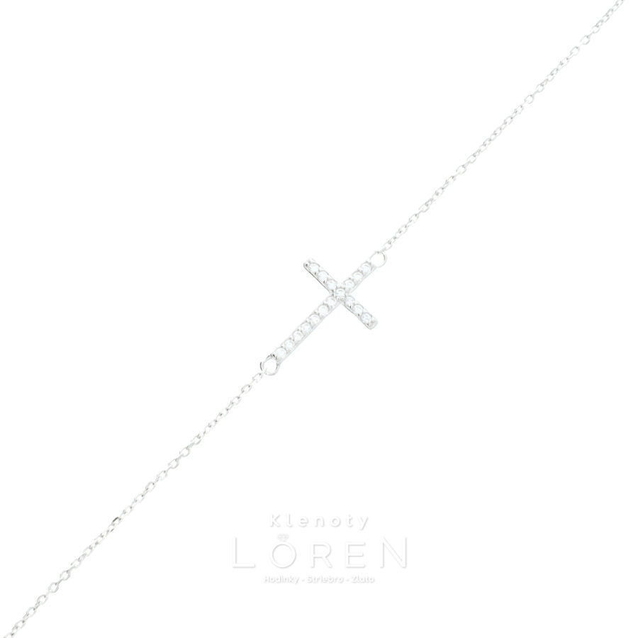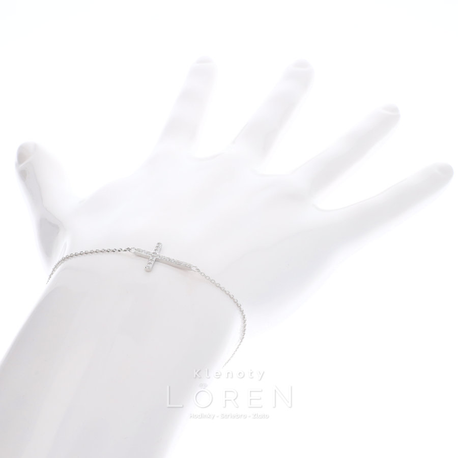 Dámsky, strieborný náramok s jemným, zirkónovým príveskom v tvare krížika.