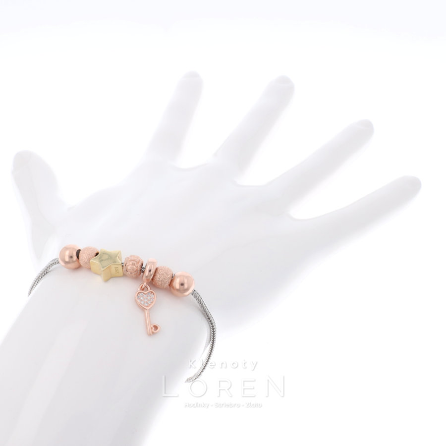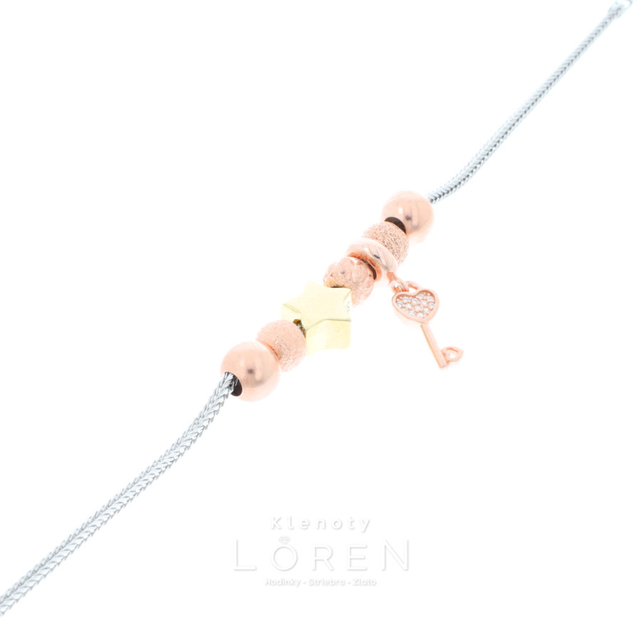 Jemný dámsky náramok v striebornej farbe s guličkami v rose gold prevedení a hviezdičkou v zlatej farbe.
