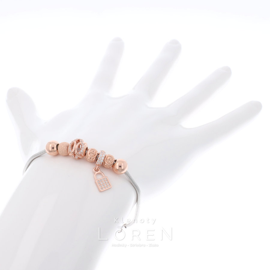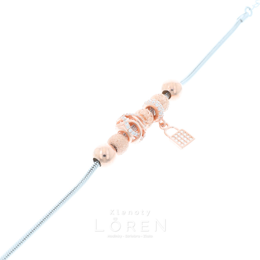 Jemný, dámsky, strieborný náramok s guličkami v medenej farbe a visiacim príveskom v tvare zámku.
