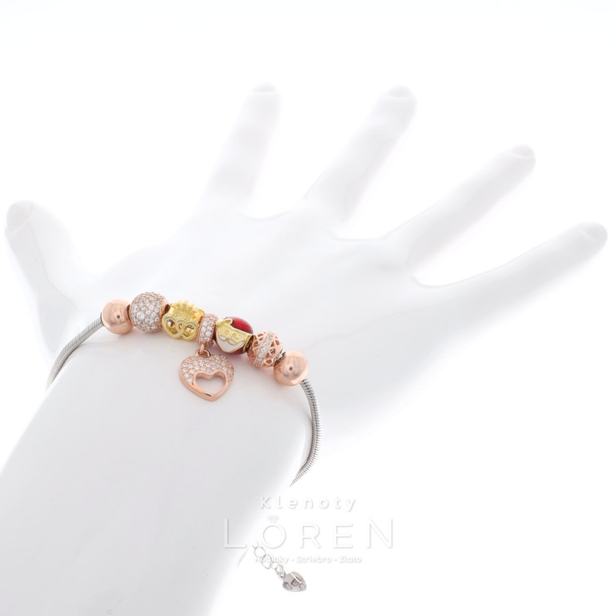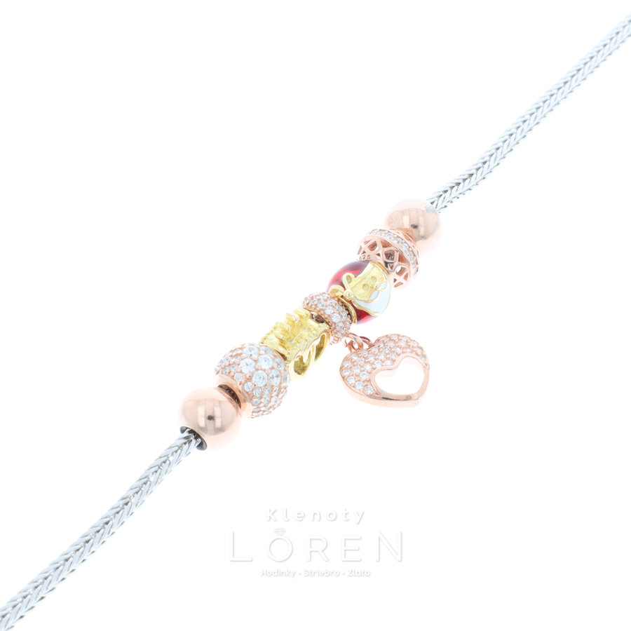 Jemný, dámsky, strieborný náramok v zlatej a medenej farbe s guličkami, srdcom a Mikulášom