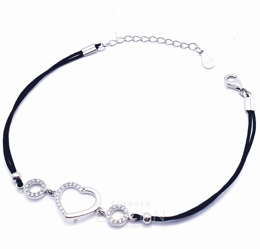 Dámsky náramok na čiernej šnúrke so strieborným príveskom - srdiečko.