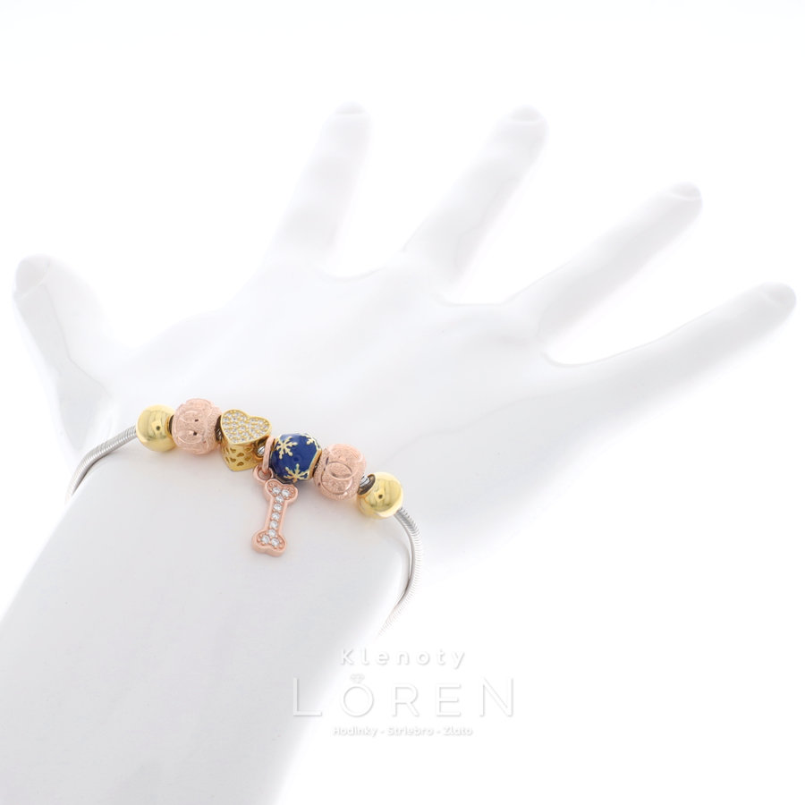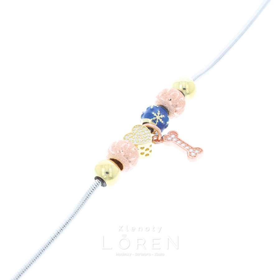 Jemný, dámsky, strieborný náramok v zlatej farbe s guličkami, srdcom so zirkónmi a psia kostička