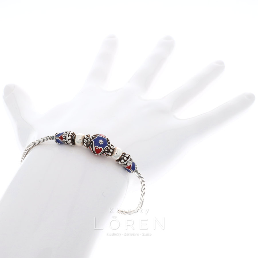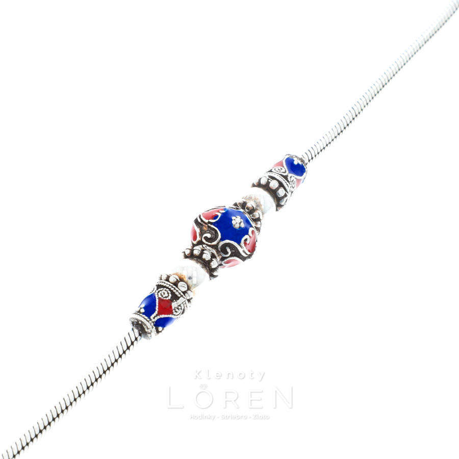 Jemný, dámsky, strieborný náramok modro červený