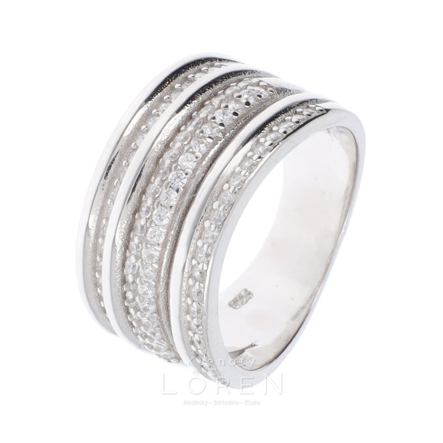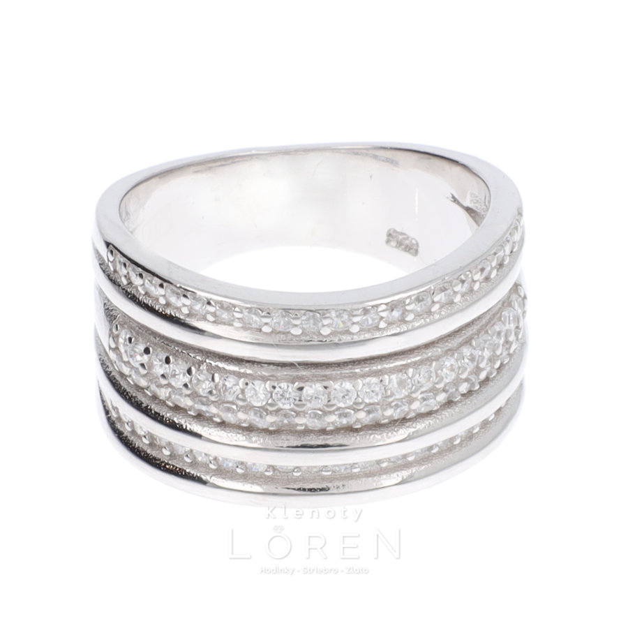 Dámsky strieborný prsteň s bielymi zirkónmi obrúčkovitého typu.