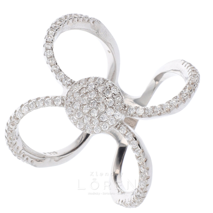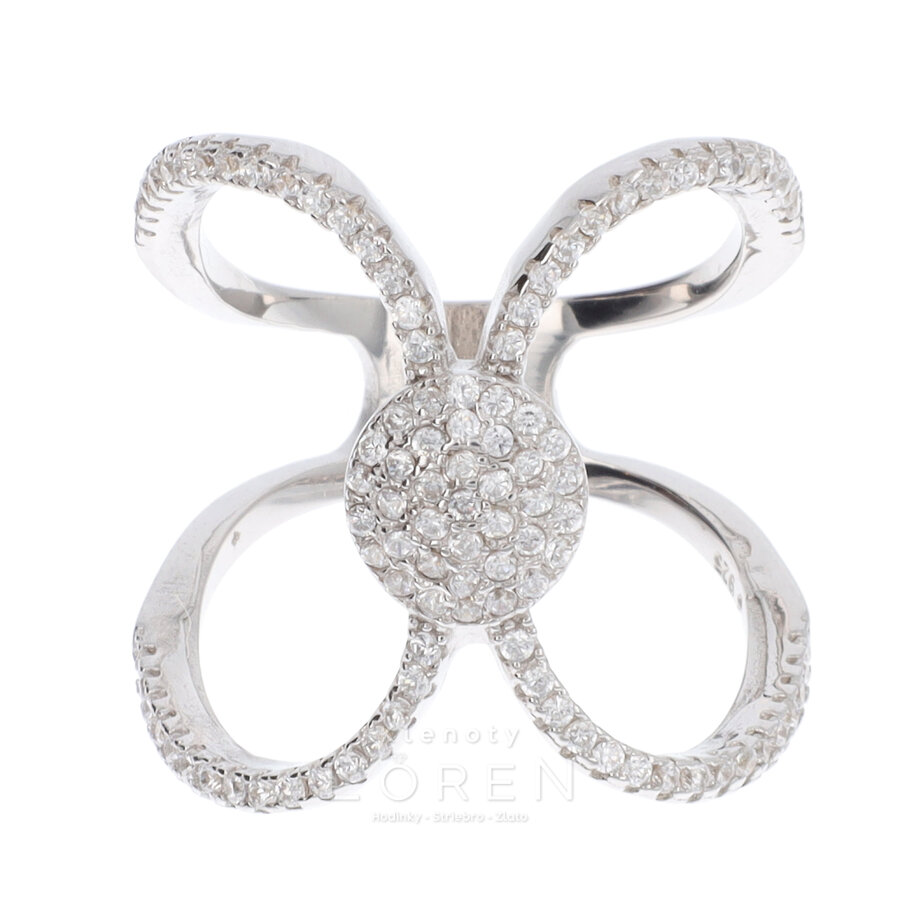 Dámsky strieborný prsteň s bielymi zirkónmi v tvare nekonečno.