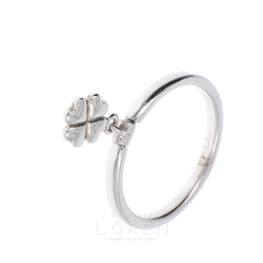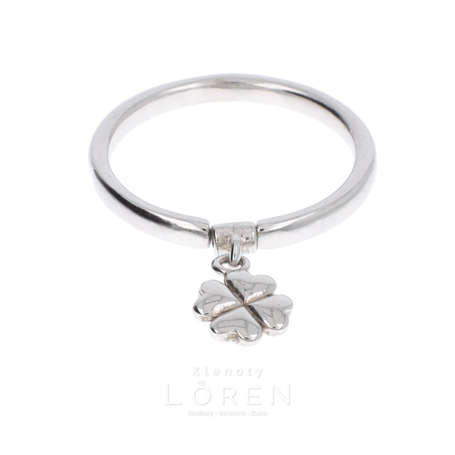 Dámsky strieborný prsteň s visiacou aplikáciu v tvare štvorlístka.