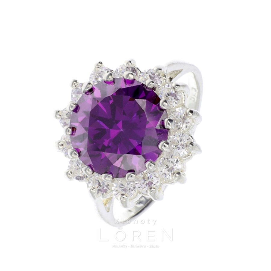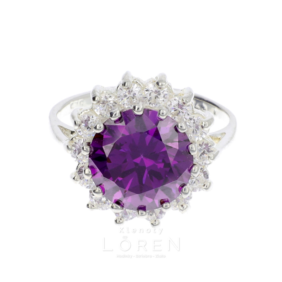 Dámsky strieborný prsteň s okrúhlym fialovým zirkónom a bielymi zirkónmi.