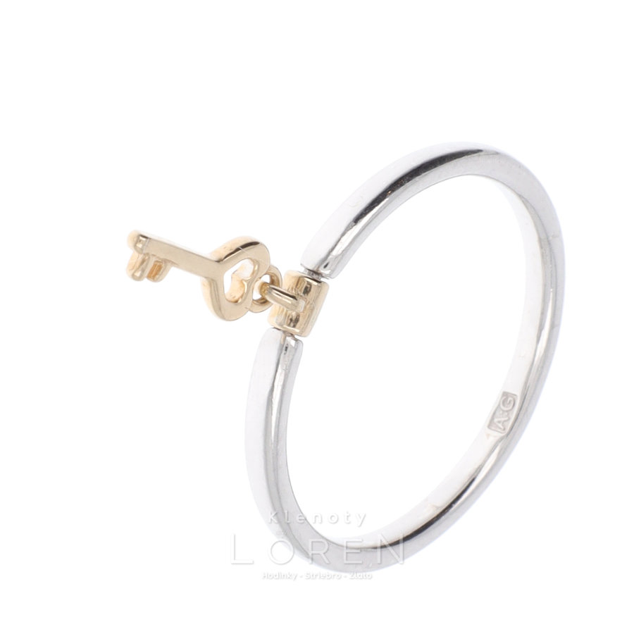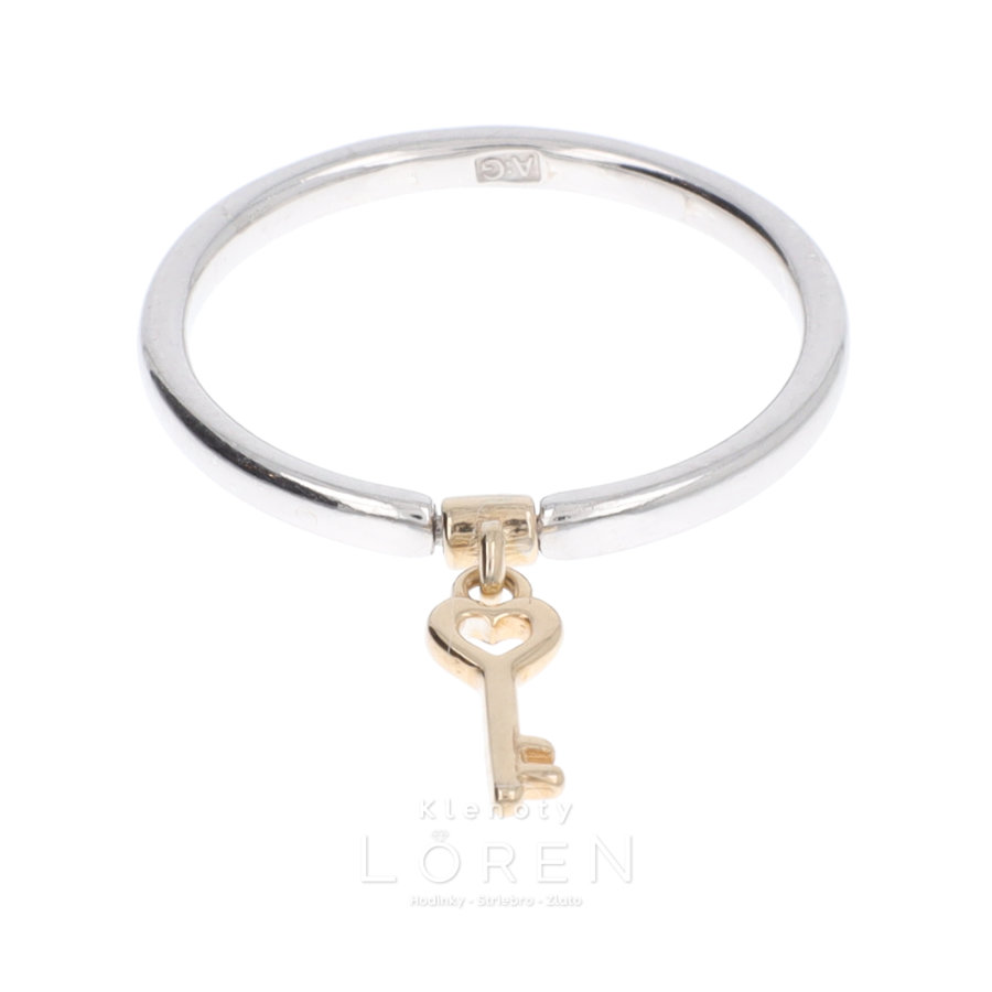 Dámsky strieborný prsteň s visiacou aplikáciou - kľúčik. Aplikácia je z materiálu pozláteného striebra.