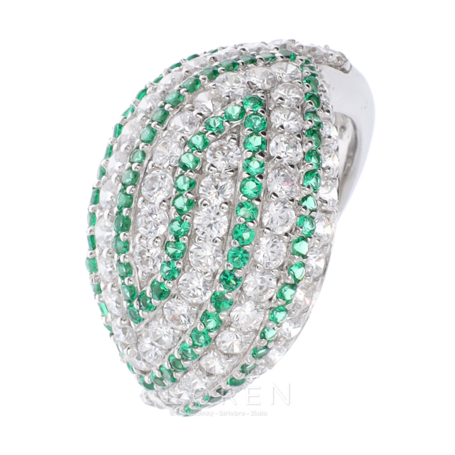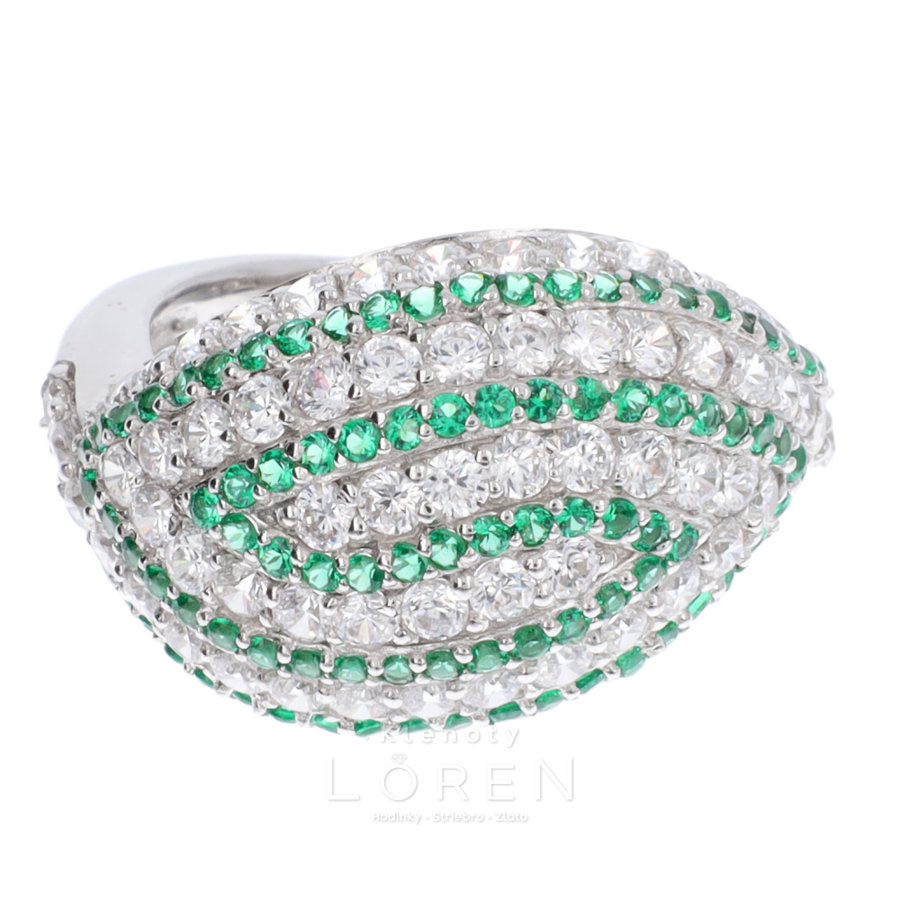 Dámsky strieborný prsteň so zelenými a bielymi zirkónmi.