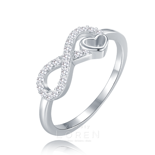 Design s motívom nekonečna a jemným srdiečkom zdobeným trblietavými bielymi zirkónmi, ktoré dodávajú prsteňu pôvab a noblesu.