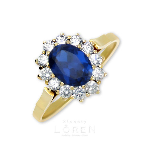 Dámsky, zlatý prsteň zo žltého zlata. Dominantou prsteňa je hlavný modrý zirkón,ktorý po obvode zdobia žiarivé biele zirkóny.