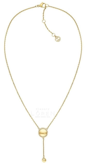 Dámsky, oceľový, náhrdelník Tommy Hilfiger v zlatej farbe s visiacou časťou a ozdobami v zlatej farbe.