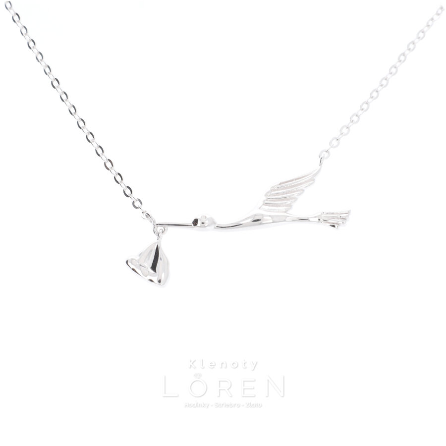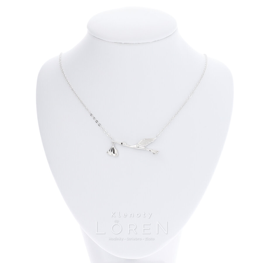 Dámsky, jemný, strieborný s bocianom a batôžtekom umiestnený v strede retiazky.