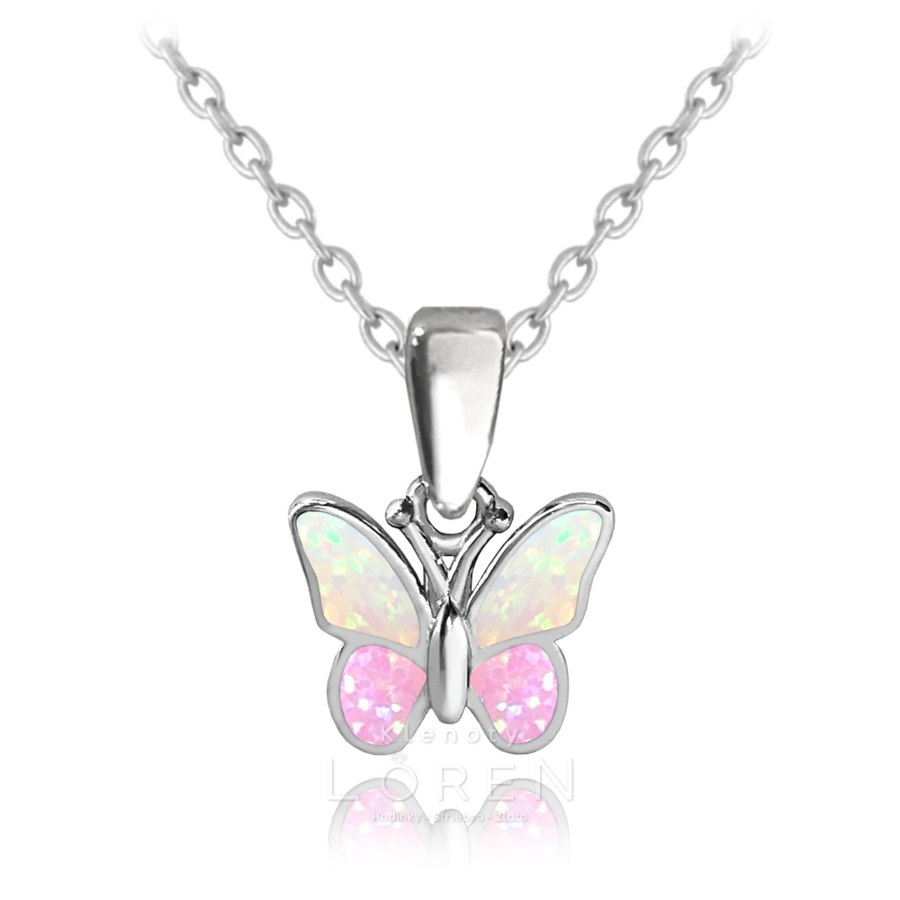 Jemný detský náhrdelník s motívom motýlika a ružovým syntetickým opálom.
