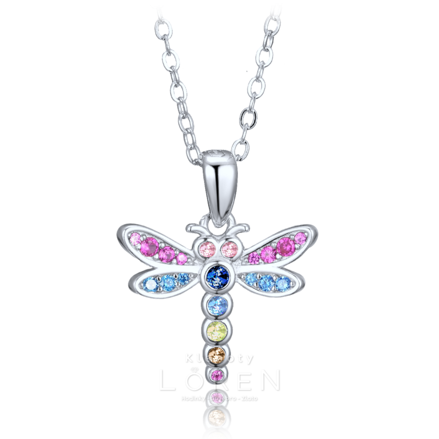 Jemný detský náhrdelník s motívom vážky zdobený trblietavými zirkónmi v modrej, ružovej a čírej farbe.