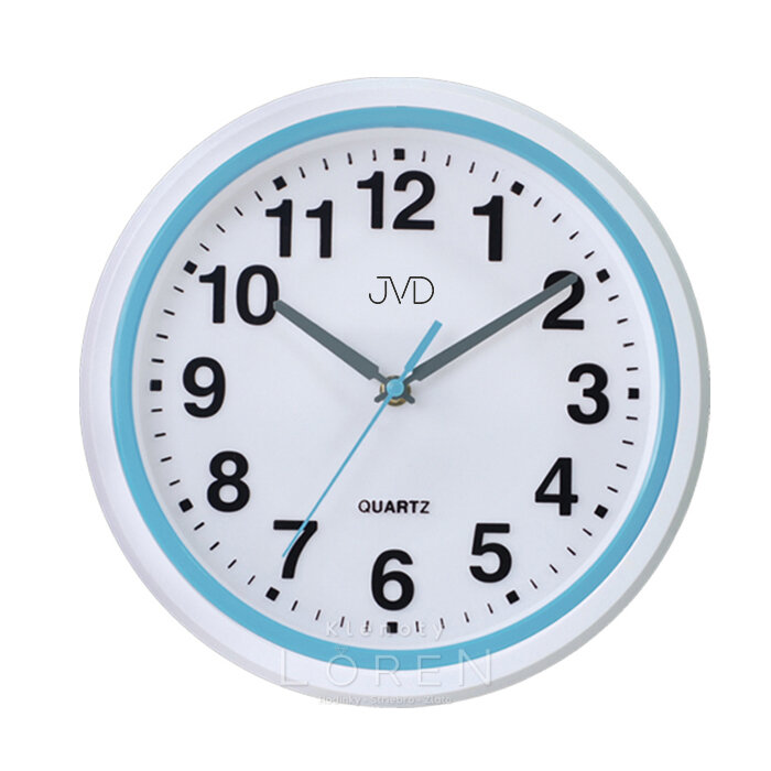Plastové nástenné hodiny JVD v modro-bielom prevedení.