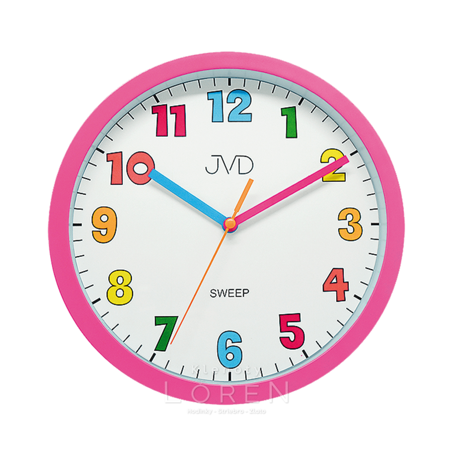 Plastové nástenné hodiny JVD v ružovom prevedení s farebnými číslicami.