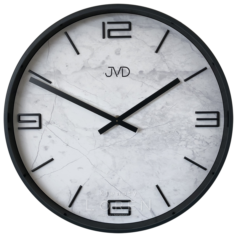 Plastové nástenné hodiny JVD v designovom prevedení.Hodiny majú ciferník z imitácie mramoru.