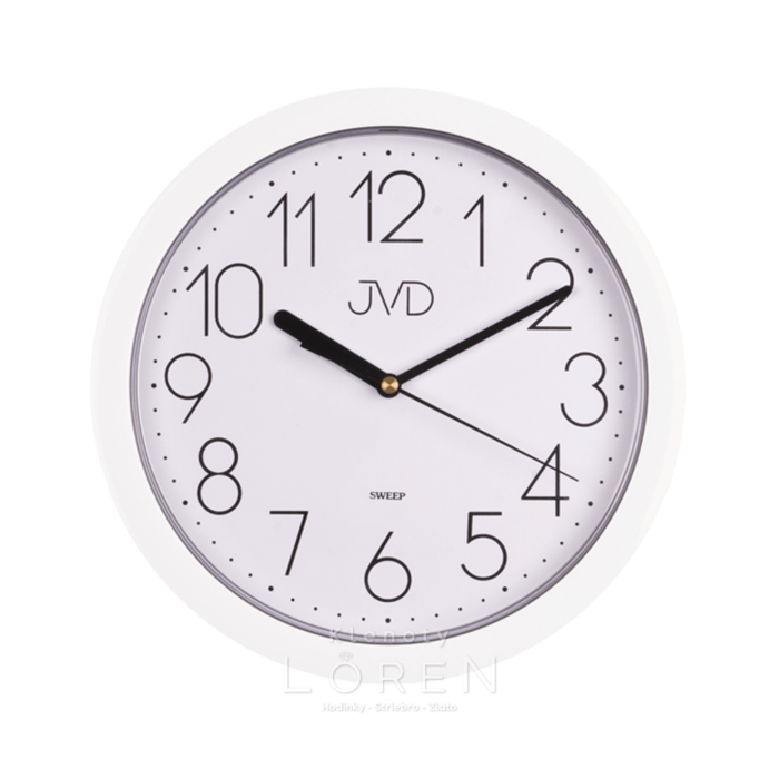 Plastové nástenné hodiny JVD v bielom prevedení.
