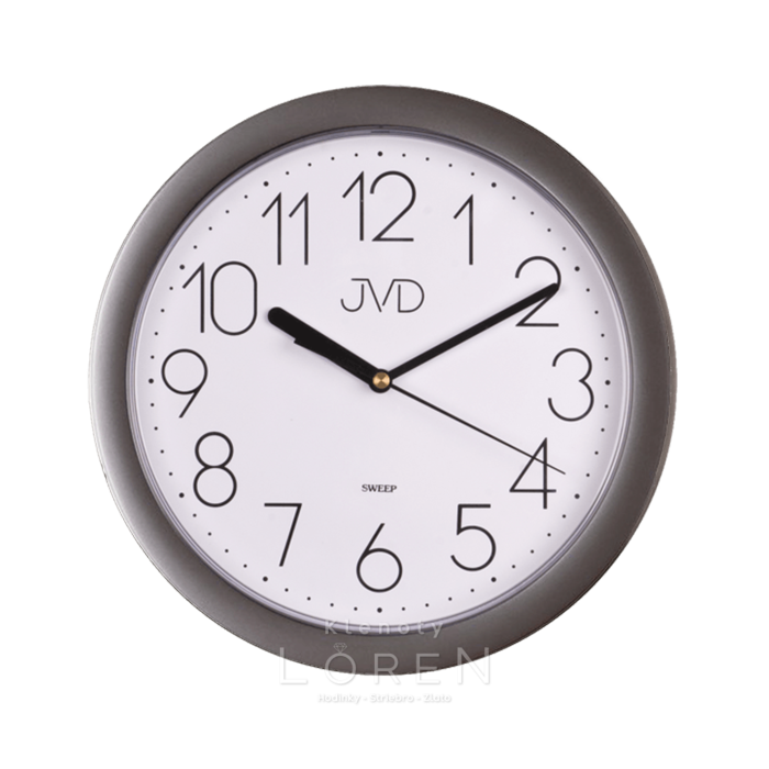 Plastové nástenné hodiny JVD v tmavosivom prevedení.
