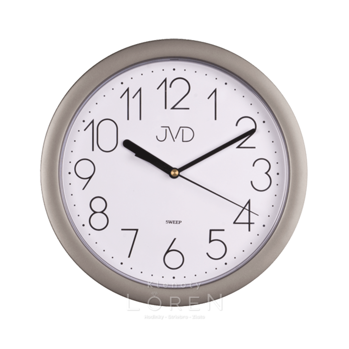Plastové nástenné hodiny JVD v sivom prevedení.